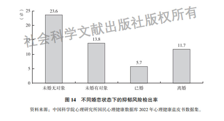 婚戀狀態(tài)的分析同樣顯示了家庭內(nèi)外支持的重要性。在各類不同婚戀狀態(tài)群體中,已婚群體的抑郁風險最低,未婚無對象群體的抑郁風險最高,抑郁風險檢出率(23.6%)遠高于已婚群體(5.7%)。雖然其中也疊加了一些年齡因素的影響,但仍顯示了擁有親密關(guān)系的支持對于心理健康的保護作用。從這一角度來說,促進青年人擁有穩(wěn)定和諧的婚戀關(guān)系、促進婚姻家庭和諧,對人們的心理健康具有重要的價值。