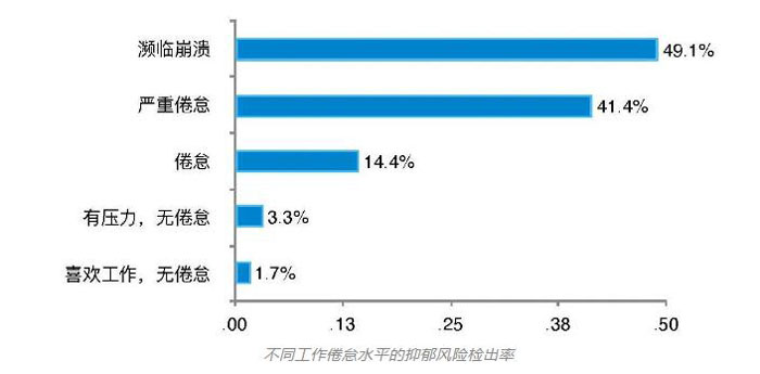 工作倦怠對抑郁風險的影響更為突出??梢钥吹?,嚴重工作倦怠的組別中,抑郁風險檢出率超過40%。存在工作倦怠但程度不嚴重的組別中,抑郁風險檢出率為14.4%,略高于平均水平。不存在工作倦怠的組別中,抑郁風險檢出率則很低。這一結(jié)果顯示,需要關(guān)注嚴重工作倦怠者的抑郁風險。