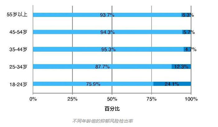 本次研究發(fā)現(xiàn)在成年人群中,青年為抑郁的高風險群體,18~24歲年齡組的抑郁風險檢出率高達24.1%,顯著高于其他年齡組。25~34歲年齡組的抑郁風險檢出率為12.3%,顯著低于18~24歲年齡組,顯著高于35歲及以上各年齡組。焦慮風險檢出率的年齡差異呈現(xiàn)類似趨勢。