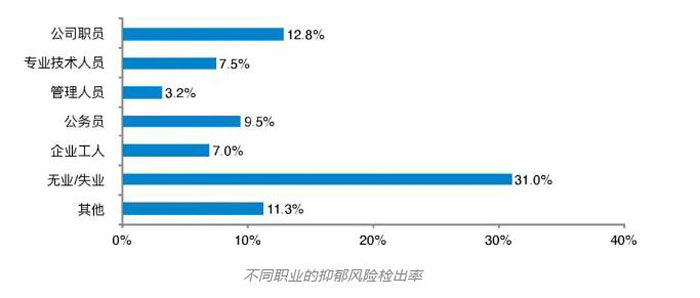 以抑郁為例,抑郁風險檢出率最高的是無業(yè)/失業(yè)人員,高達31.0%,遠遠高于其他職業(yè)群體的抑郁風險檢出率。抑郁風險檢出率最低的是管理人員,為3.2%。