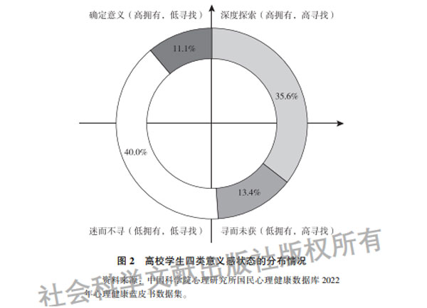 報(bào)告顯示,青少年、高校學(xué)生、成年職業(yè)人員均有約一半的人感到自己找到了生活意義。其中青少年有49.1%的人處于擁有人生意義的狀態(tài),而有38%的人處于迷茫狀態(tài);高校學(xué)生有46.7%的人處于擁有人生意義的狀態(tài),有40%的人處于迷茫的狀態(tài);成年人有62.3%的人處于擁有人生意義的狀態(tài),而有36%的人處于迷茫狀態(tài)。