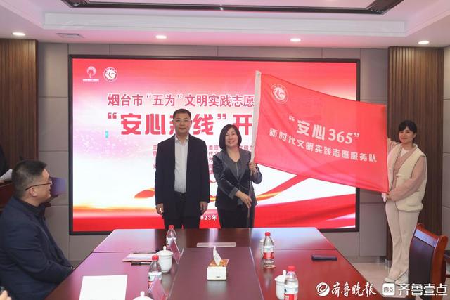 煙臺(tái)市新時(shí)代文明實(shí)踐和志愿服務(wù)指導(dǎo)中心負(fù)責(zé)人為煙臺(tái)市心理康復(fù)醫(yī)院志愿服務(wù)隊(duì)授旗,同步成立“安心365”新時(shí)代文明實(shí)踐志愿服務(wù)隊(duì)。(記者呂奇攝)