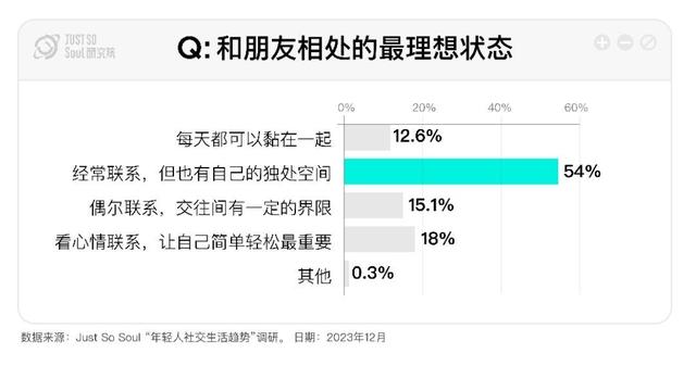 面對“和朋友相處的最理想狀態(tài)”這一問題時,有54%的年輕人選擇“經(jīng)常聯(lián)系,但也有自己的獨處空間”,僅有12.6%的年輕人選擇“每天都可以黏在一起”。強調(diào)個體獨立意識的年輕一代在構(gòu)建友誼時,更注重的是邊界感和自我空間問題,這也是“找搭子”持續(xù)火熱,“零糖”社交成為新趨勢的原因。