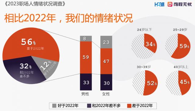 受訪者中56%認(rèn)為2023年的情緒狀況不如上一年。情緒上的受壓感方面,男性的感受比女性強(qiáng)烈得多。24歲以下的年輕人表示“情緒狀態(tài)好于2022年”的人數(shù)占比最高,工作幾年后的25~29歲職場人則多數(shù)心境相反,相較之下,年過三十的職場人出于家庭和企業(yè)內(nèi)的職責(zé)加重、波動(dòng)的環(huán)境和模糊的職業(yè)前景,感受到的情緒壓力最為沉重。