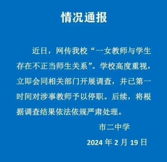 發(fā)布時(shí)間:2024-02-22 09:23:49 | 來源:中國(guó)網(wǎng)心理中國(guó) | 作者:張子琪近日,網(wǎng)傳上海市第二中學(xué)一女教師被丈夫?qū)嵜e報(bào)出軌16歲學(xué)生。2月19日,上海市第二中學(xué)發(fā)布情況通報(bào)稱,學(xué)校高度重視,并已第一時(shí)間對(duì)涉事教師予以停職。