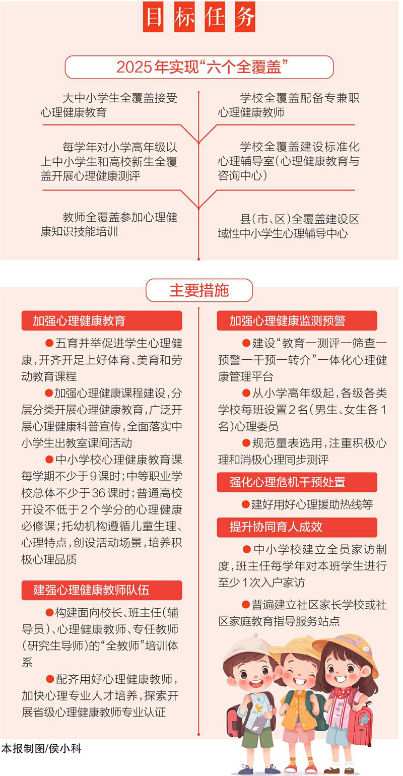 主要措施實。從加強心理健康教育、建強心理健康教師隊伍、加強心理健康預警防控、強化心理危機干預處置、提升協(xié)同育人成效5個方面,細化提出17條具體要求,對學生心理健康工作薄弱環(huán)節(jié)提出明確要求。