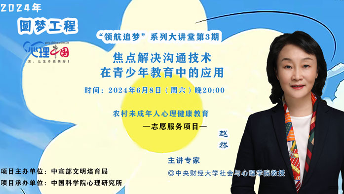 6月8日(周六)晚20:00,中國(guó)網(wǎng)心理中國(guó)聯(lián)合中科院心理研究所開(kāi)啟“領(lǐng)航追夢(mèng)”系列大講堂第三期心理科普直播講座,特邀中央財(cái)經(jīng)大學(xué)社會(huì)與心理學(xué)院教授趙然,深入剖析“焦點(diǎn)解決溝通技術(shù)”在青少年家校教育中的實(shí)際應(yīng)用。屆時(shí),中國(guó)網(wǎng)心理中國(guó)平臺(tái)將進(jìn)行直播(具體見(jiàn)文內(nèi)視頻直播框)。