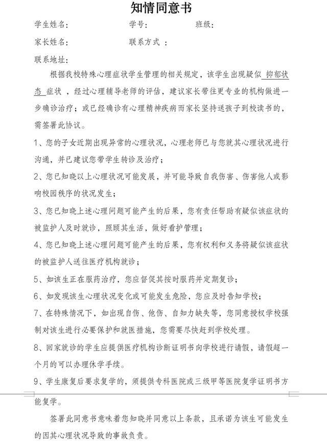 2023年11月下旬,學(xué)校方面給郭先生發(fā)來一份《知情同意書》,并表示,需提供三甲醫(yī)院的診斷證明,再簽署這份《知情同意書》可返校上課。