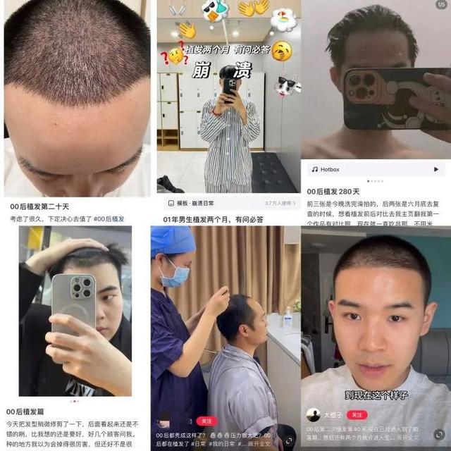 在小紅書等社交平臺(tái)上,這類視頻并不少見。00后們紛紛曬出了自己日益稀疏的后腦勺和后退的發(fā)際線,大家彼此鼓勵(lì)打氣一起接受植發(fā)。他們自我調(diào)侃:“00后整頓職場(chǎng)?不,他們整頓的是自己的發(fā)際線!”