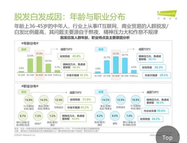 根據(jù)艾瑞咨詢發(fā)布的《2024年中國脫發(fā)白發(fā)理療產(chǎn)業(yè)洞察報(bào)告》,年齡36-45歲的中年人,從事IT互聯(lián)網(wǎng)、商業(yè)貿(mào)易的人群脫發(fā)/白發(fā)比例最高,其問題主要源自熬夜、精神壓力大和作息不規(guī)律。