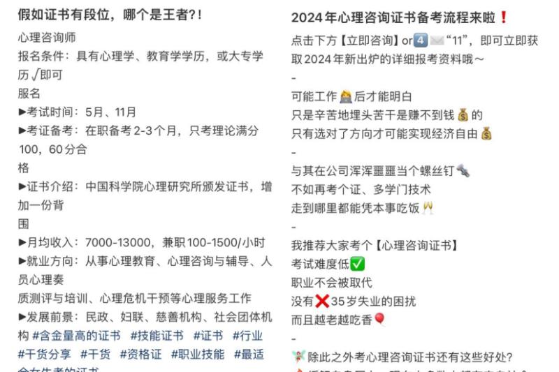 作為非準(zhǔn)入類職業(yè),網(wǎng)上不少培訓(xùn)機構(gòu)將心理咨詢師培訓(xùn)合格證包裝成從業(yè)資格證,在社交平臺上發(fā)布招收信息,如“考試難度低”“沒有失業(yè)困擾”“全都是選擇題”“隨時隨地學(xué)”等,讓心理咨詢師被塑造為“速成”職業(yè)。