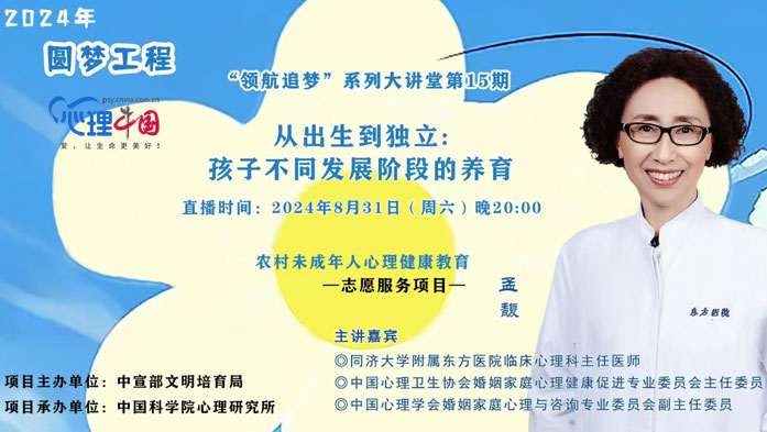 2024年“圓夢(mèng)工程”——農(nóng)村未成年人心理健康教育志愿服務(wù)項(xiàng)目,由中宣部文明培育局委托中國(guó)科學(xué)院心理研究所國(guó)民心理健康評(píng)估發(fā)展中心負(fù)責(zé)具體實(shí)施。“領(lǐng)航追夢(mèng)”系列大講堂作為該項(xiàng)目的重要組成部分,將邀請(qǐng)心理、教育、醫(yī)療等相關(guān)領(lǐng)域的資深專家,連續(xù)開(kāi)展20場(chǎng)左右的線上公益直播講座,為廣大農(nóng)村未成年兒童及其家長(zhǎng)和教師提供在線心理健康知識(shí)科普與問(wèn)題解答。(中國(guó)網(wǎng)心理中國(guó)網(wǎng)址:http://m.sl3server.com/)