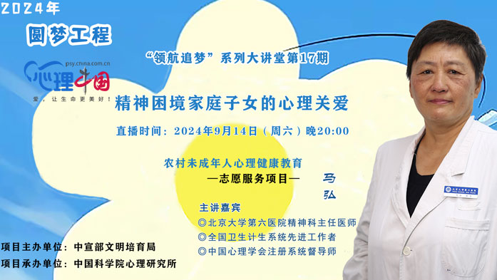 本期大講堂特邀北京大學(xué)第六醫(yī)院精神科主任醫(yī)師馬弘,聚焦“精神困境家庭子女的心理關(guān)愛”,在愛與理解的燈塔下,共同探索如何為特殊家庭的孩子撐起一片心靈的晴空。屆時,中國網(wǎng)心理中國平臺將進行直播(具體見文內(nèi)視頻直播框)。