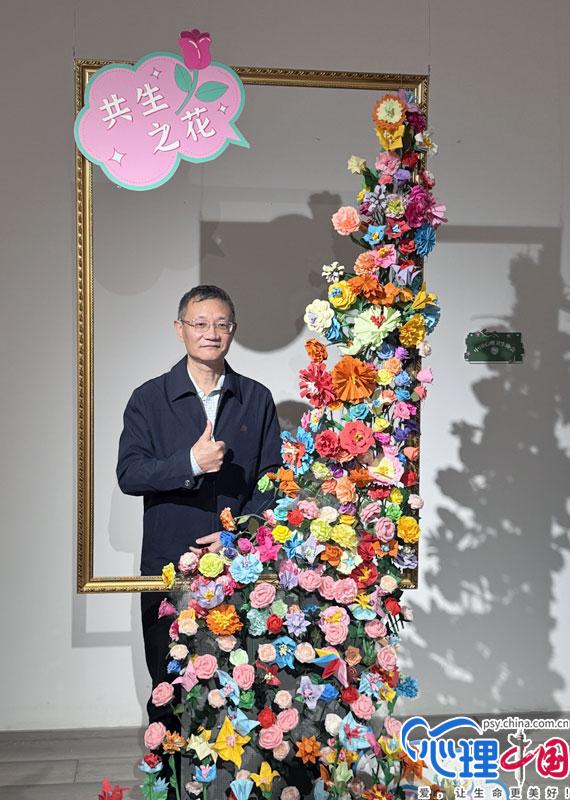 在“共生之花”互動裝置藝術(shù)展區(qū),五彩繽紛的花朵如同一條彩色的河流,從懸浮在空中的希望之窗中流瀉下來,奔向遠(yuǎn)方,匯成花的海洋?;ǘ渚鶠榫裾系K患者的手工作品,象征和而不同;朵朵鮮花在燦爛的陽光下綻放,象征著社會對精神障礙患者的接納與和諧共存。觀眾可以在希望之窗前與“花?!焙嫌?,以自身的關(guān)愛行動呼吁社會各界為精神障礙患者共同營造一個更加理解和支持的環(huán)境。