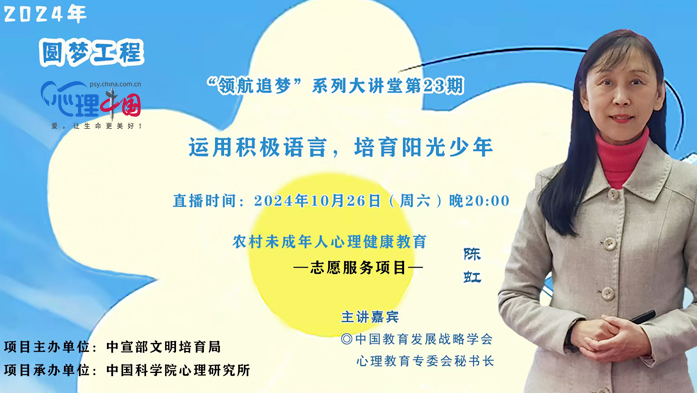 發(fā)布時間:2024-10-25 21:01:12 | 來源:中國網心理中國 | 作者:辛理中國網心理中國10月25日訊 10月26日(周六)晚20:00,中國網心理中國聯(lián)合中科院心理研究所開啟“領航追夢”系列大講堂第23期心理科普直播講座。