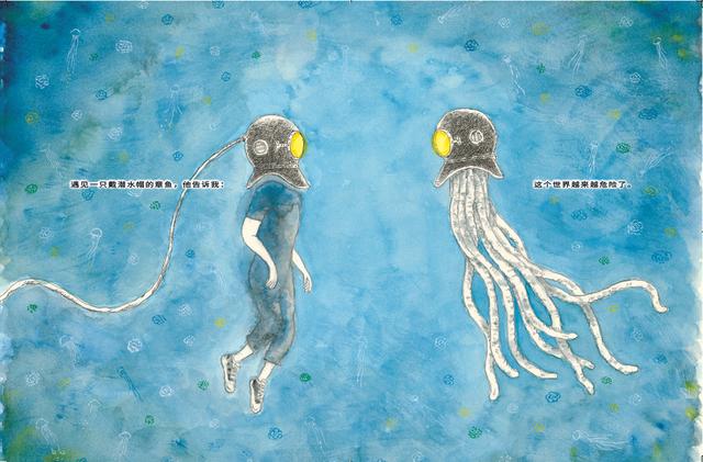 “遇見(jiàn)一只帶著潛水帽的章魚(yú),他告訴我這個(gè)世界越來(lái)越危險(xiǎn)了?!痹陂_(kāi)篇朱德庸寫(xiě)下了這樣一段話,展現(xiàn)出我們與世界之間的反復(fù)拉扯。關(guān)注現(xiàn)代人的困境一直以來(lái)都是朱德庸很重要的創(chuàng)作主題,他的多部作品都從不同維度和視角闡釋這一問(wèn)題。在新作中,朱德庸將筆鋒向內(nèi),對(duì)準(zhǔn)了自我困境,將內(nèi)心的敏感多思、細(xì)膩又內(nèi)耗的精神世界展現(xiàn),“今天很多人以為自己在跟著時(shí)代走,但實(shí)際上很多人是在跟著錢(qián)的速度跑?,F(xiàn)在人之所以不快樂(lè),產(chǎn)生這么多的困境,就是因?yàn)槲覀兌荚谟脛e人的速度要求自己。”如果用流行的MBTI來(lái)說(shuō),這本書(shū)堪稱(chēng)是I人的內(nèi)心世界大放送。