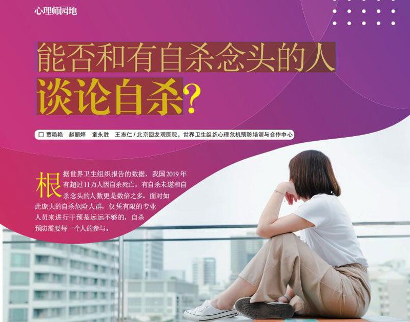 不論是針對處于危機中的個人,還是群體的危機預防工作,讓更多的人了解與學習如何與產(chǎn)生自殺念頭的人談?wù)撟詺⑹潜匾矣袔椭?。這就像鋪開了一個防護網(wǎng)絡(luò),讓有自殺危險的人不會無助地墜落。每個人都是網(wǎng)絡(luò)的一個節(jié)點,大家齊心協(xié)力,努力托起那些處于孤獨與絕望中的人。(賈艷艷 趙麗婷 童永勝 王志仁/北京回龍觀醫(yī)院,世界衛(wèi)生組織心理危機預防培訓與合作中心 中國網(wǎng)心理中國特約《心理與健康》雜志供稿 網(wǎng)址:http://m.sl3server.com/)