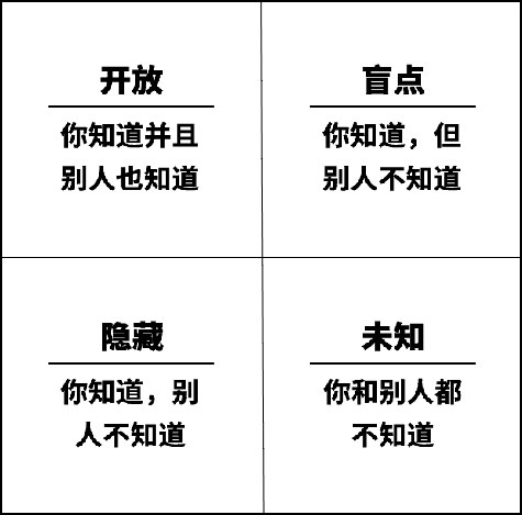 未知區(qū)是自己和別人都不知道的信息,比如:某人自己潛在的心理風險。未知區(qū)是尚待挖掘的黑洞,對未知區(qū)的探索可以擴展意識邊界,增強對自我的認識,總體來說,對潛能發(fā)揮有好處。