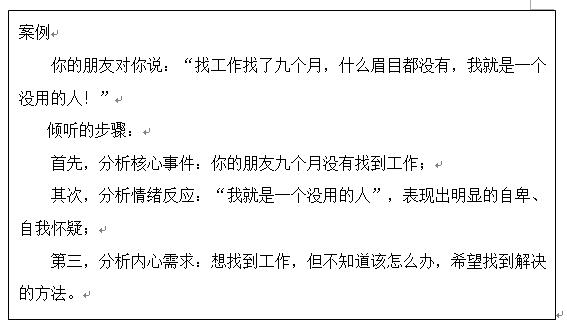 傾聽時,需要首先從事實信息入手,抓住對方想表達的核心事件;其次,圍繞核心事件,傾聽對方所表達的情緒反應(yīng);最后,從情緒反應(yīng)中,分析對方?jīng)]有明確表達的內(nèi)心需求。下列案例運用了這個方法。
