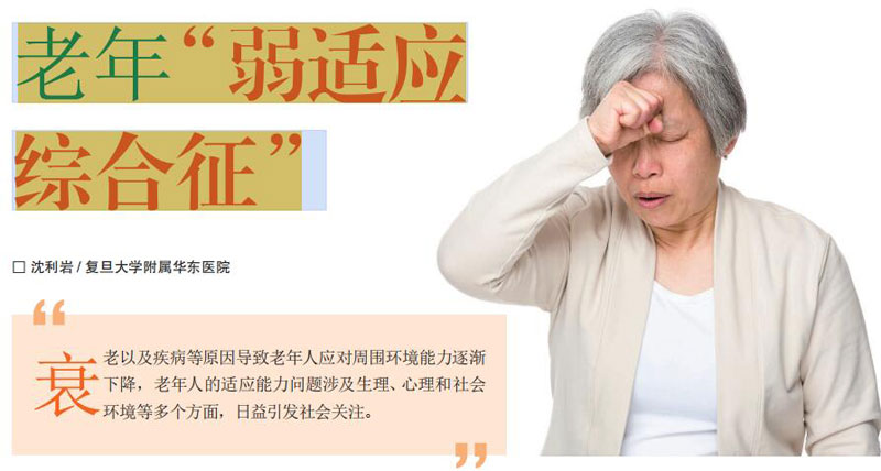 “弱適應(yīng)綜合征”,或稱“適應(yīng)障礙綜合征”“活動(dòng)障礙綜合征”,是指?jìng)€(gè)體因衰老或疾病等導(dǎo)致的各類身心功能障礙,導(dǎo)致的對(duì)環(huán)境、任務(wù)、角色等方面適應(yīng)能力下降或喪失。