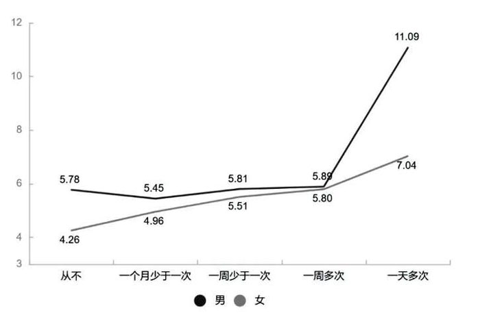有趣的是,網(wǎng)絡(luò)購(gòu)物頻率與心理健康的關(guān)系存在性別差異。男性最常見(jiàn)的網(wǎng)絡(luò)購(gòu)物頻率是“一個(gè)月少于一次”,女性最常見(jiàn)的則是“一周多次”。研究表明,網(wǎng)絡(luò)購(gòu)物頻率增加,抑郁風(fēng)險(xiǎn)水平升高,尤其在女性中更為明顯。