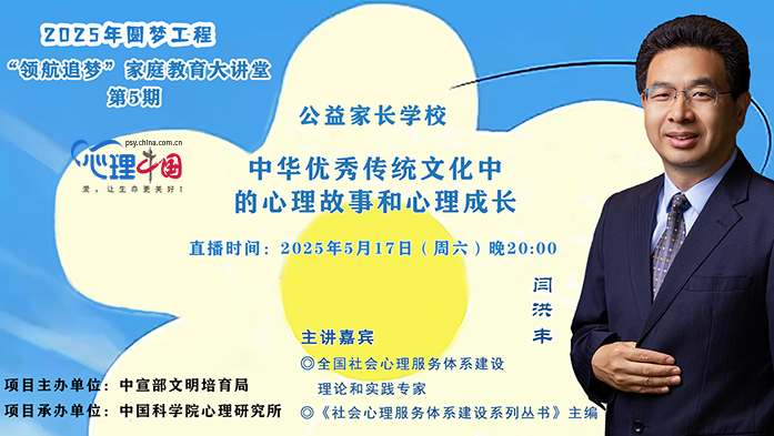 發(fā)布時間:2025-05-16 13:49:59 | 來源:中國網(wǎng)心理中國 | 作者:辛理中國網(wǎng)心理中國5月16日訊 5月17日(周六)晚20:00,中國網(wǎng)心理中國繼續(xù)聯(lián)合中科院心理研究所開啟“領(lǐng)航追夢”家庭教育大講堂心理科普直播講座。