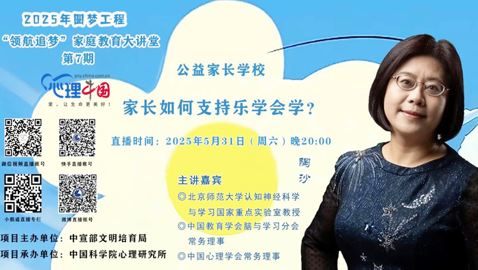 發(fā)布時間:2025-05-30 16:00:35 | 來源:中國網(wǎng)心理中國 | 作者:辛理中國網(wǎng)心理中國5月30日訊 5月31日(周六)晚20:00,中國網(wǎng)心理中國繼續(xù)聯(lián)合中科院心理研究所開啟“領(lǐng)航追夢”家庭教育大講堂心理科普直播講座。
