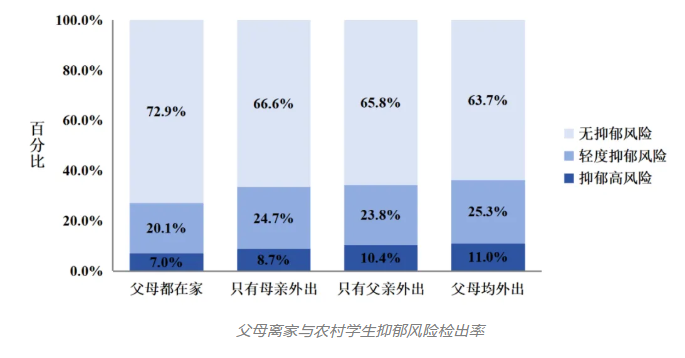 空間距離。父母長期外出、學生住校都會增加心理健康風險。父母均外出的學生抑郁高風險率最高。