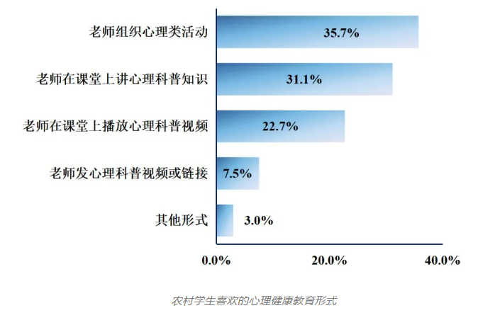 心理健康教育活動。報告指出,89.8%的學校開展心理課,農村學生最喜歡的心理健康教育方式是教師組織開展的心理類活動,而不是純粹的講授課程。