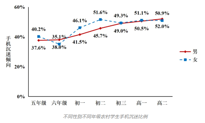 手機沉迷現(xiàn)象嚴重,初中階段尤為突出。報告指出,46.1%的學生傾向于不能忍受沒有手機,43.8%的學生傾向于即使未使用手機也會一直想著它。不同性別不同年級農村學生的手機沉迷傾向存在差異,初二女生表現(xiàn)出更強烈的手機沉迷傾向。