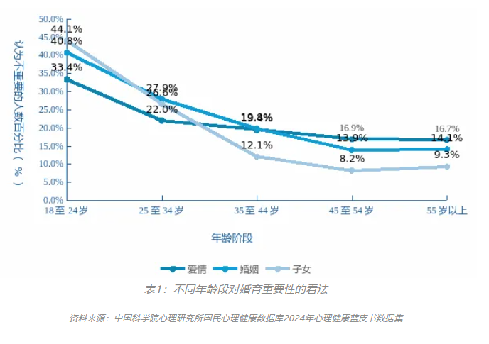 調(diào)查還發(fā)現(xiàn),隨著年齡階段的增加,對(duì)愛(ài)情、婚育持消極態(tài)度的比例呈下降趨勢(shì)。