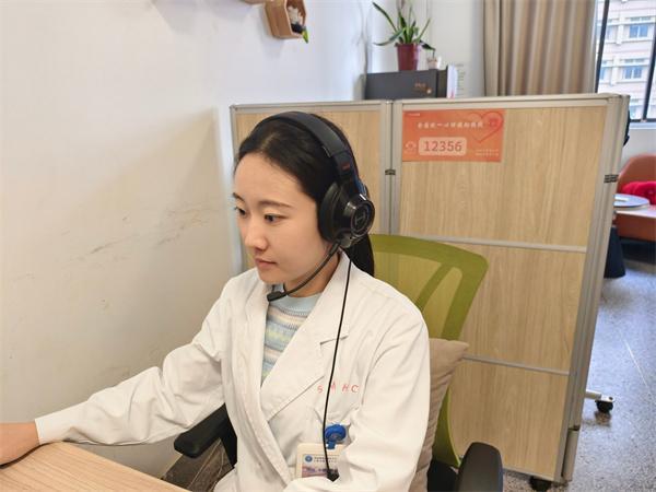 上海市精神衛(wèi)生中心心理治療師楊騰斐在接聽來電。受訪者供圖