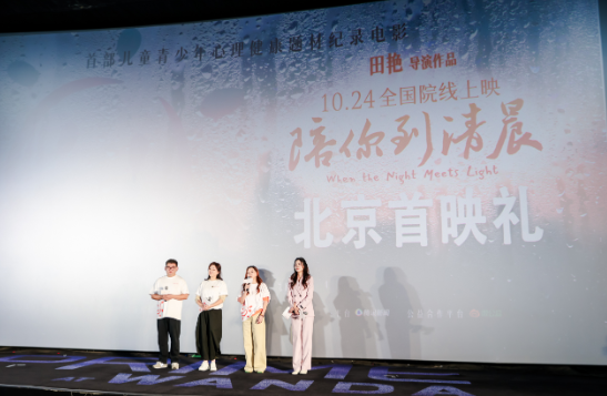 中國網(wǎng)心理中國10月19日訊 10月18日,聚焦兒童青少年心理健康題材的紀錄電影《陪你到清晨》在北京CBD萬達影城舉行首映禮。影片導演田艷、制片人郭菲、發(fā)行人董超和影片里所有角色出席了首映禮,來自醫(yī)療界、教育界、媒體界、企業(yè)界等超過800人參與了當天的觀影活動。映后,主創(chuàng)團隊分享了這部耗時六年打磨的紀錄電影背后的動人故事。